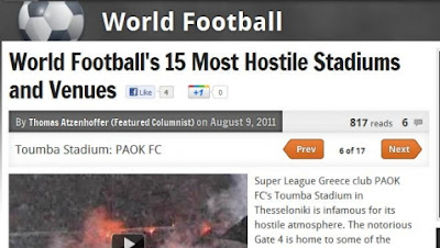 Για την κάθε έδρα υπάρχει και ένα ξεχωριστό κείμενο και όσον αφορά την Τούμπα η ιστοσελίδα αναφέρει: «Η Τούμπα είναι... διαβόητη για την εχθρική ατμόσφαιρα που δημιουργούν οι οπαδοί του ΠΑΟΚ. Η περιβόητη Θύρα 4 φιλοξενεί μερικούς από τους πιο παθιασμένους οπαδούς της ομάδας. Προσπαθούν να βρίσκονται στο πλευρό της σε κάθε αγώνα, καθώς επιδιώκουν να ανατρέψουν την κυριαρχία των τριών μεγάλων στην Ελλάδα του Ολυμπιακού, Παναθηναϊκού και της ΑΕΚ».